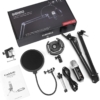 - What you get: a USB microphone, a boom arm stand, a metal shock mount, a pop filter, and a USB cable
